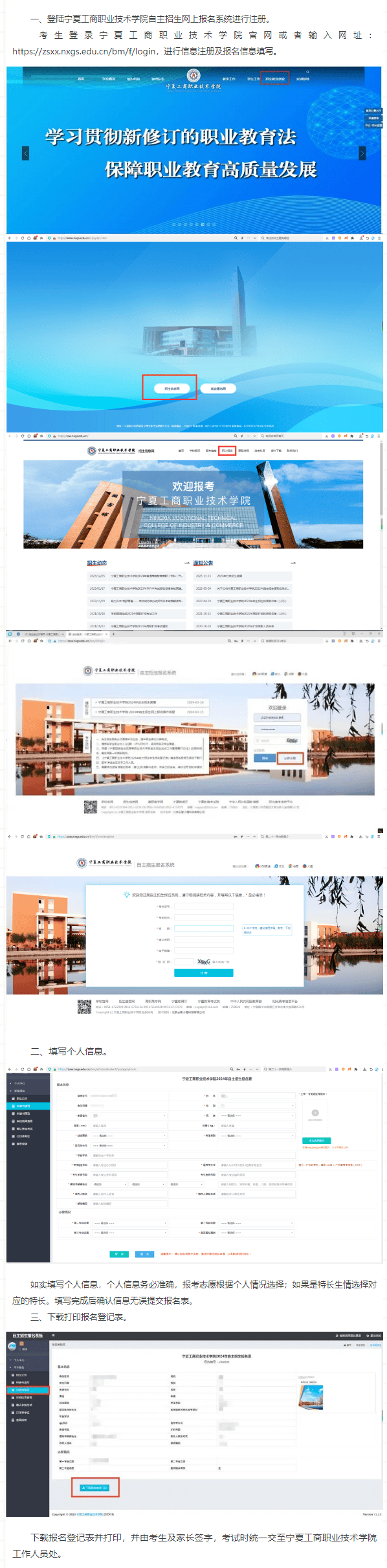(1)考生登陆“宁夏工商职业技术学院自主招生报名系统”按要求完成信息填报;